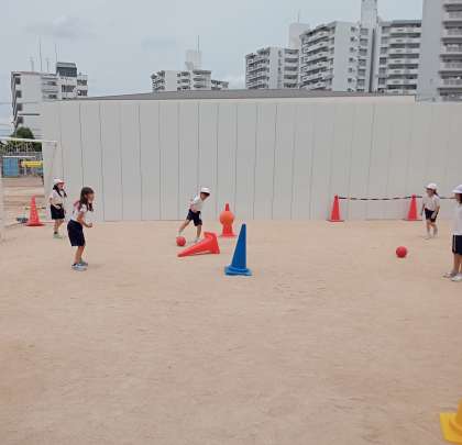 二人組になって、コーンを狙ってボールを投げる運動をしました。