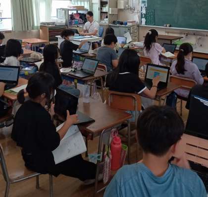 一人一台パソコンでタイピングの練習をしています。どんどん速くなっています。