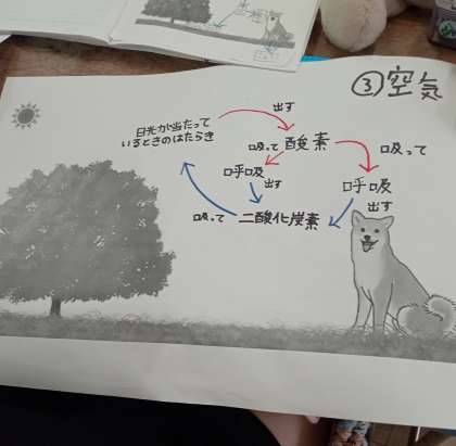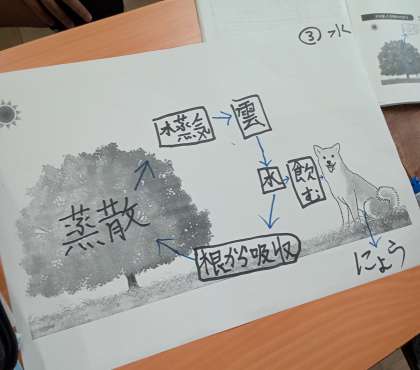水や空気に関して、生物同士にはどのようなつながりがあるのかを班で話し合いました。