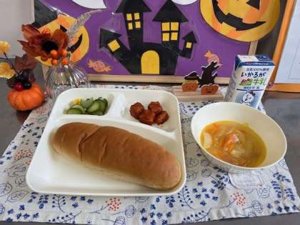 オーロラ煮は、でんぷんで揚げたまぐろにケチャップ、砂糖、赤みそで作ったタレをからませます。児童に人気のある献立です。