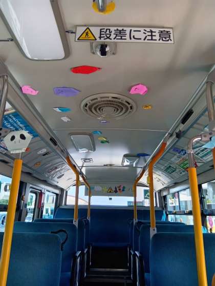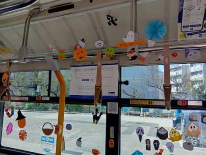 5年生が、大阪市営バスのハロウィンのためのバスの飾りを作って、バスの内部の飾り付けをしました。26日(土)27日(日)限定で運行する予定です。