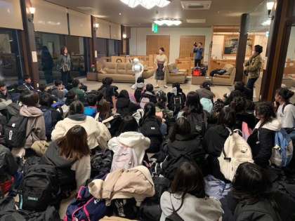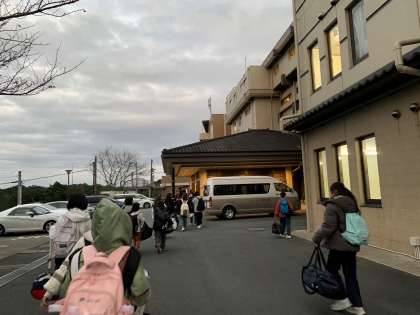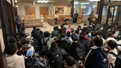 宿舎「みち潮」に着きました。宿舎の玄関ロビーで開舎式をしました。