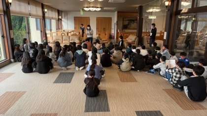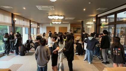 二日目の朝です。宿舎からみた風景、朝のつどいの様子、朝のつどいの後グループで今日のめあてを確認しました。全員元気で、健康状態は良好です。