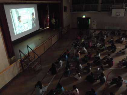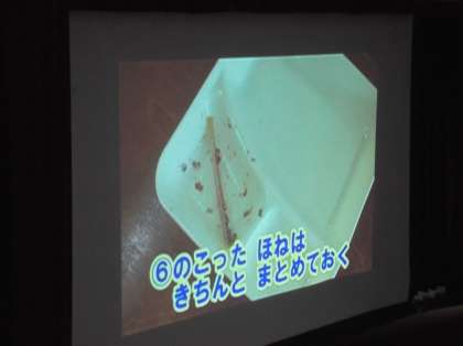 子どもたちが、骨のある魚の上手な食べ方や豆献立について、ビデオ発表をしていました。