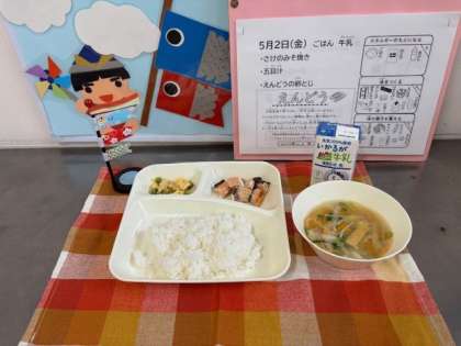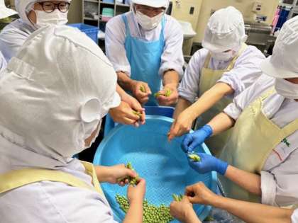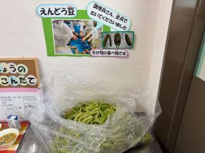 日本各地で育てられ、1年中出回っていますが、たくさん採れておいしい時期は、春から夏の初めです。今日の「えんどうの卵とじ」は給食室でさやから豆を取り出したえんどうを使っています。
