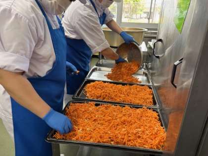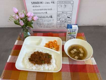 給食では、細切りにしたにんじん、ささみ、かつおぶしと調味料を混ぜ合わせ、焼き物機で焼きます。卵は使っていません。