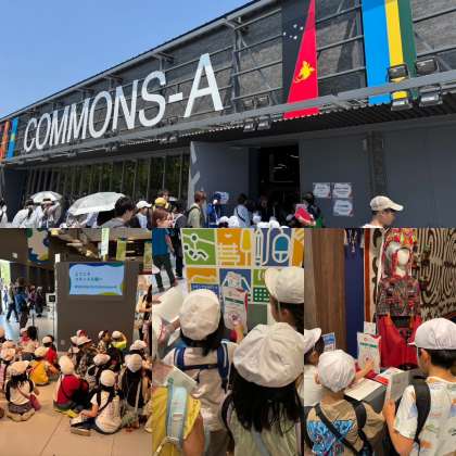 コモンズA館では、グループで興味をもった国を詳しく見学しながら、スタンプラリーを楽しんでいます。