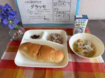 グラッセは、フランス料理の一つで、バターを加えて煮つめ、つやを出した料理のことです。今日の給食のうずら豆のグラッセは、バターの代わりにオリーブ油でつやを出しています。