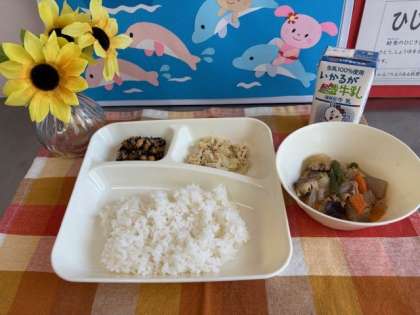 給食のひじき豆は、大豆を油であげ、ひじき、砂糖、しょうゆを合わせたたれをからませて作ります。かみごたえのある料理です。よくかんで食べましょう。