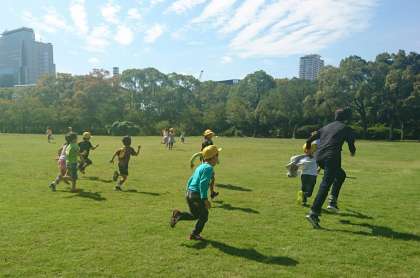 昼食後は、広大な芝生で、思いきり遊びました。かけっこ、おにごっこ、走って走って汗をいっぱいかいて、帰途につきました。