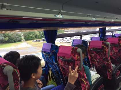 上野SAを出て、スペイン村に向かっています。バスの中ではリクエスト曲を聴いています。それぞれがお気に入りの曲をマイクを回して歌っています。