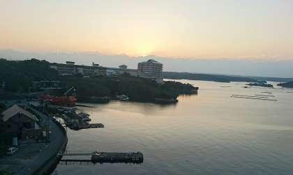すばらしい朝を迎えました。穏やかな水上に、今から漁に出る小舟が一艘。