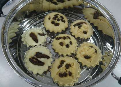 生地をしっかりかくはんして、カップに注ぎます。ナッツ、チョコレート、レーズン、いちじくなどをトッピングして、約10分間蒸します。