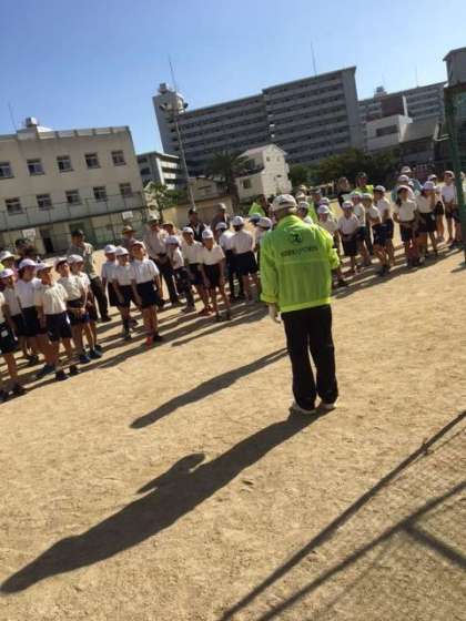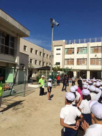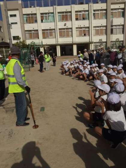 10月27日の午後に、4年生が老人クラブの方々と一緒にグランドゴルフをしました。児童代表のあいさつの後、グループに分かれて行いました。児童ははじめてのグランドゴルフで、まずはクラブの使い方やルールを老人クラブの方々に教えていただきました。