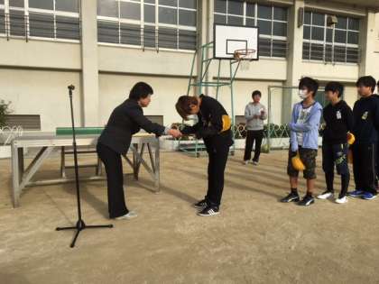 今年度、本校は「大阪府学校給食」の優良校に選ばれ、学校表彰をされました。10月31日の全校朝会で、児童を代表して給食委員会に授与しました。