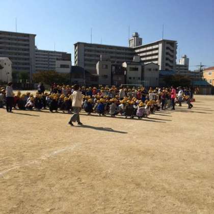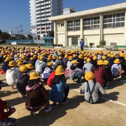 11月4日の2時間目に、火災を想定した避難訓練を行いました。全校児童の避難が完了した後は、避難するときの約束「お(押さない)・は(走らない)・し(しゃべらない)・も(戻らない)」の話をしました。