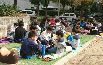 音楽交流会が無事終わり、近くの公園でお弁当を食べました。緊張もとけ、ほっと一息できたひととき。今日のお弁当は、特に美味しかったでしょうね。