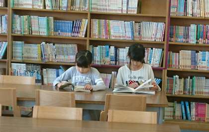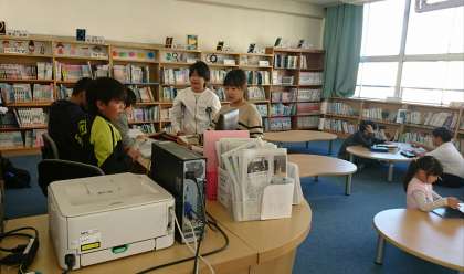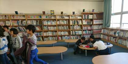 読書に夢中になっている子どもたち、グループで調べ学習をしている子どもたち、また、本を借りるためにたくさんの子どもたちが並んでいました。
