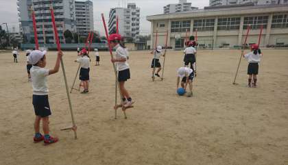 1年生の体育の授業で、「竹馬」の練習をしました。はじめて挑戦する児童も多く、バランスをとることから始めました。低いところから、徐々にたかくしていって、少しずつ歩行できるようになった児童もいます。