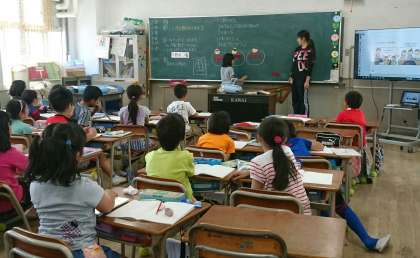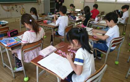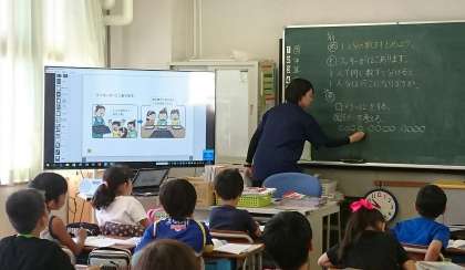 3年生の算数は、「わり算」の学習をしています。おはじきを使い、何人に分けられるか、答えを自分で考え、見つけていきます。