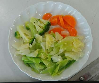 今回は「ゆで野菜のサラダ」に挑戦です。ニンジンやキャベツを切って、茹でていきます。フレンチソ—スもサラダ油、酢、塩、こしょうを適量に混ぜ合わせて作りました。