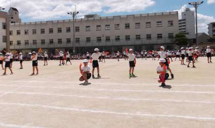 5年生の団体演技「SUN SUN SUN」、オレンジが空に舞って、さわやかなダンスが印象的でした。細かい動きも最高に決まっていました。