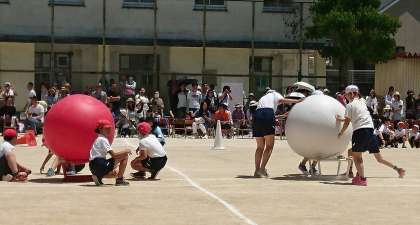 「心をひとつに」全員が赤・白に分かれての大玉おくりです。練習もしましたが、本番はうまくいったようです(?)