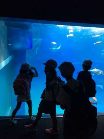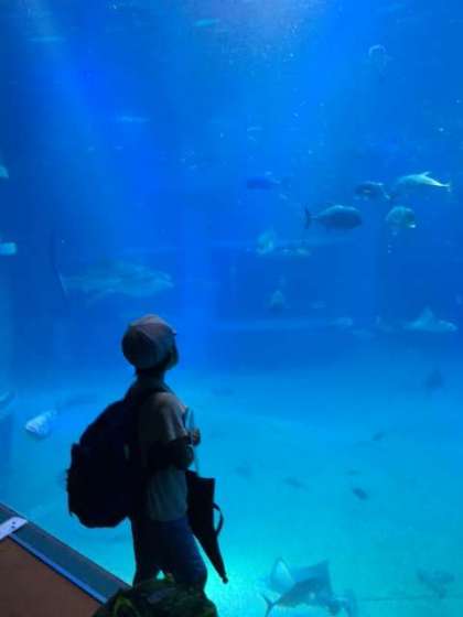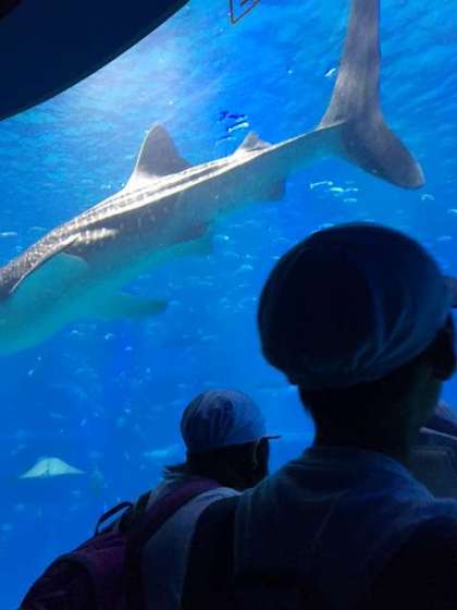 館内を進んでいくと、巨大な水槽にジンベエザメやイトマキエイなどが泳いでいて、その大きさに驚いてしまいました。