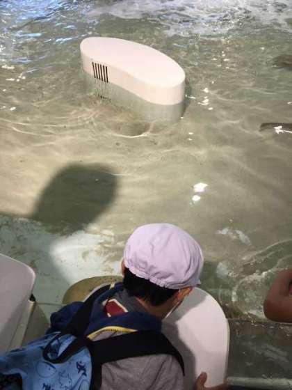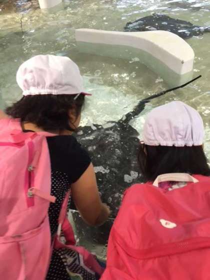 海の生き物に触れるコーナーでは、水槽で泳いでいるサメやエイをおそるおそる触って、感触に驚きました。