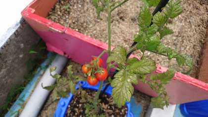 2年生は、ミニトマトの栽培を楽しみにしています。すでに実が熟し、赤く熟したミニトマトをとりました。