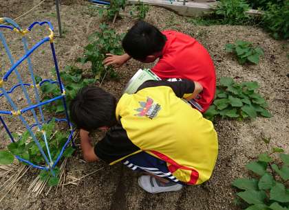 学習園の草花もどんどん成長しています。子どもたちが植えたアサガオ、マリーゴールド、南京などの茎や葉がしっかりと伸びています。