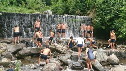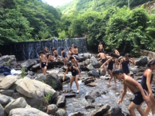 魚つかみのあとは、すぐ横で、川遊びに夢中になりました。上流には小さな滝が流れていて、格好の遊び場でした。