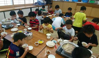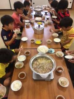 夕食は鴨鍋です。みんなで仲良く鍋を囲みました。どのテ—ブルも残さずいただきました。