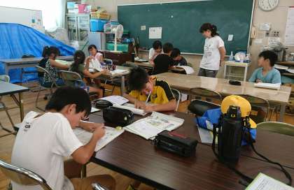 1年・5年、2年・4年、3年・6年、と3つの教室に分かれて学習をしています。宿題を自主的に進めていますが、わからないところは学びサポーターの先生に教えてもらいます。