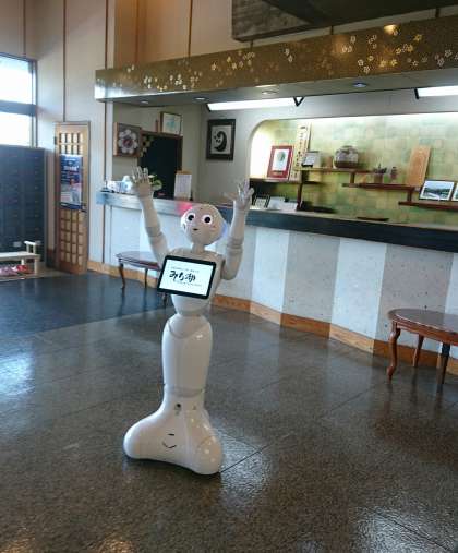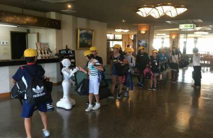 玄関では、昨日出迎えてくれたロボットの「かしこちゃん」が手をを振って見送ってくれました。
