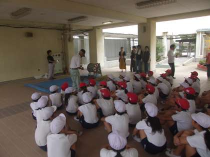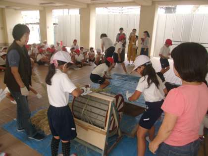 9月27日(水)、先日収穫した稲穂を脱穀機を使って脱穀し、もみ米にしていきました。はぐくみボランティアの方々や中村さんにもお手伝いしていただき、脱穀作業を進めていきました。手動で回しながら、子どもたちはやや戸惑いながらも興味をもって取り組みました。取りきれなかった分は手作業で行いました。