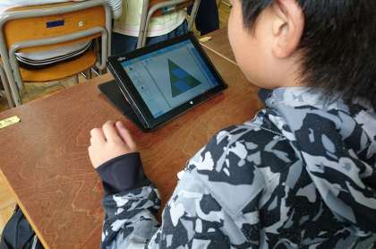 パターンブロックを組み合わせて、いろいろな形を考えました。タブレット端末を使うことにより、図形を操作したり、グループで自分のつくった作品を見せ合ったりしました。