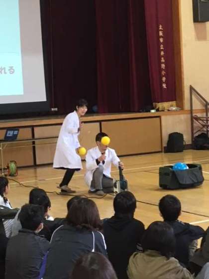 11月6日(月)の2時間目に、プログラミング教育の一環として、6年生を対象に大阪成蹊大学の福岡先生と赤澤先生にお越しいただき、理科の特別授業を実施していただきました。今回は「浮き玉実験」で、ブロアーを使っていろいろなものが浮くかどうかを見せていただきました。