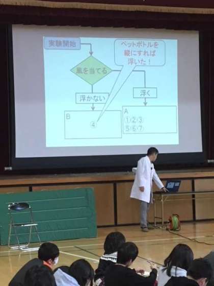スチロールのボールに始まり、ペットボトルやインスタントラーメンのカップ、ビーチボールなどの予想を立ててから、実験の開始です。また、ワークシートには考えが整理しやすいように「フローチャート」で書かれていて、プログラミング的思考で考えられるようになっていました。