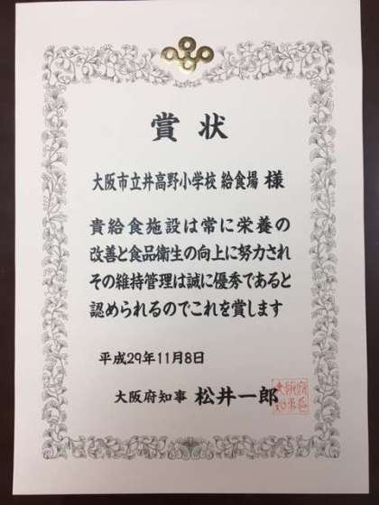 本校の給食施設において、「平成29年度大阪府保健衛生関係功労者・優良施設知事表彰」の対象として選ばれ、「食品衛生関係優良施設」の表彰を受けました。