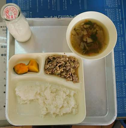 そして、今日は給食も学期最後の日です。献立は「冬至献立」で「豚肉と干しずいきのみそ煮」「すまし汁」「焼きかぼちゃの甘みつかけ」「ご飯」「牛乳」。いつも美味しい給食を作っていただき、感謝の気持ちでいただきました。3学期もよろしくお願いいたします。