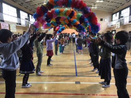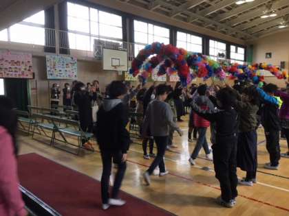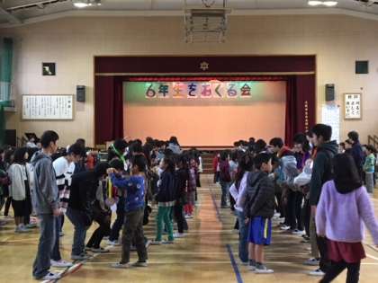 3月8日(木)の2時間目に、6年生を送る会を行いました。全学年の児童が一緒に過ごす最後の学校行事になります。6年生が花のアーチをくぐって入場し、はじめに1年生が6年生にメダルのプレゼントをしました。