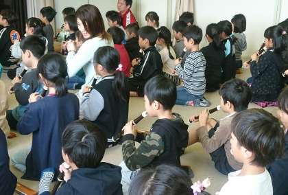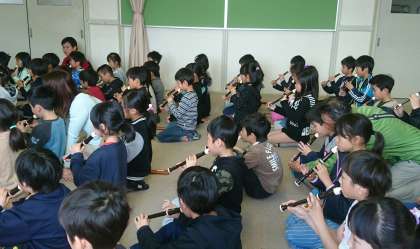 まず、ソプラノリコーダーのほかに、いろいろなリコーダーを吹いて紹介していただき、子どもたちはそれぞれの音色に感動しました。