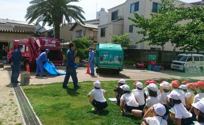 4月26日(金)の2、3時間目、4年生を対象に「ごみ収集のパッカー車」の体験授業を実施しました。大阪市の環境局より出前授業に来ていただきました。