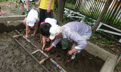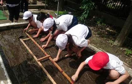 6月7日(木)の5・6時間目、5年生は田植えを体験しました。ボランティアの中村さんをはじめ、はぐくみネットの皆さん、また保護者の方も来ていただき、田植えの指導をしてくださいました。