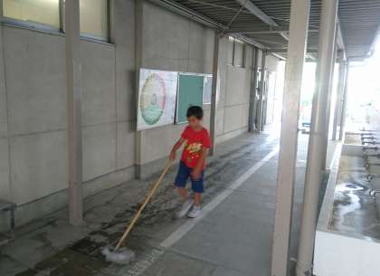 給食委員の子どもたちは、給食室の掲示をはがし、感謝の気持ちを込めて掃除をしました。