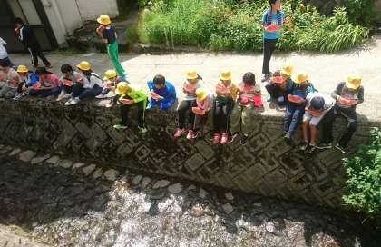 そのあとは、岡口屋さん恒例の「すいかの種飛ばし」が始まりました。全員が、宿舎の前を流れている小さな川の端にすわって、すいかを食べながら、できるだけ遠くに種を飛ばします。