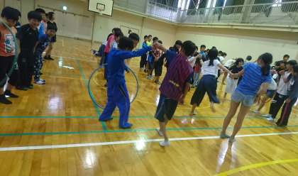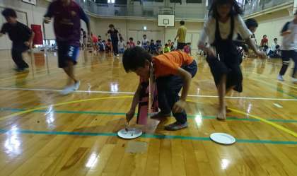 体育館で、室内オリンピックを予定通り実施しました。「風船割り」「やり投げ」「フラフ—プリレー」など、10種目のゲームで競いました。