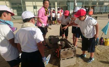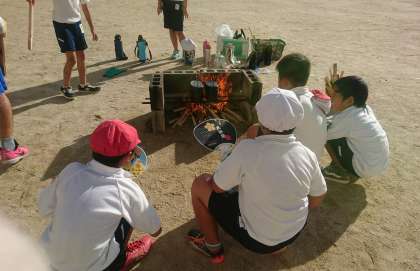 火おこしや包丁を使う経験の少ない子どもたちは、怖がりながらも一生懸命頑張っています。