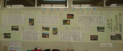 職員室前の廊下に、夏休み中に実施した「のびのびタイム」の学習を掲示しています。4年生、5年生の参加児童が学習した内容をまとめてあります。5年生が体験した林間学習の思い出の作文の発表会(夏休みに実施)は、4年生も参加して聞きました。